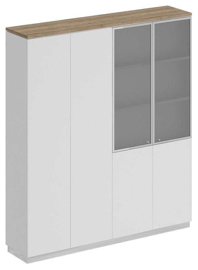 Шкаф состоит из шкафа для документов со стеклом и закрытого шкафа для документов под общим топом, цоколя и дверей.