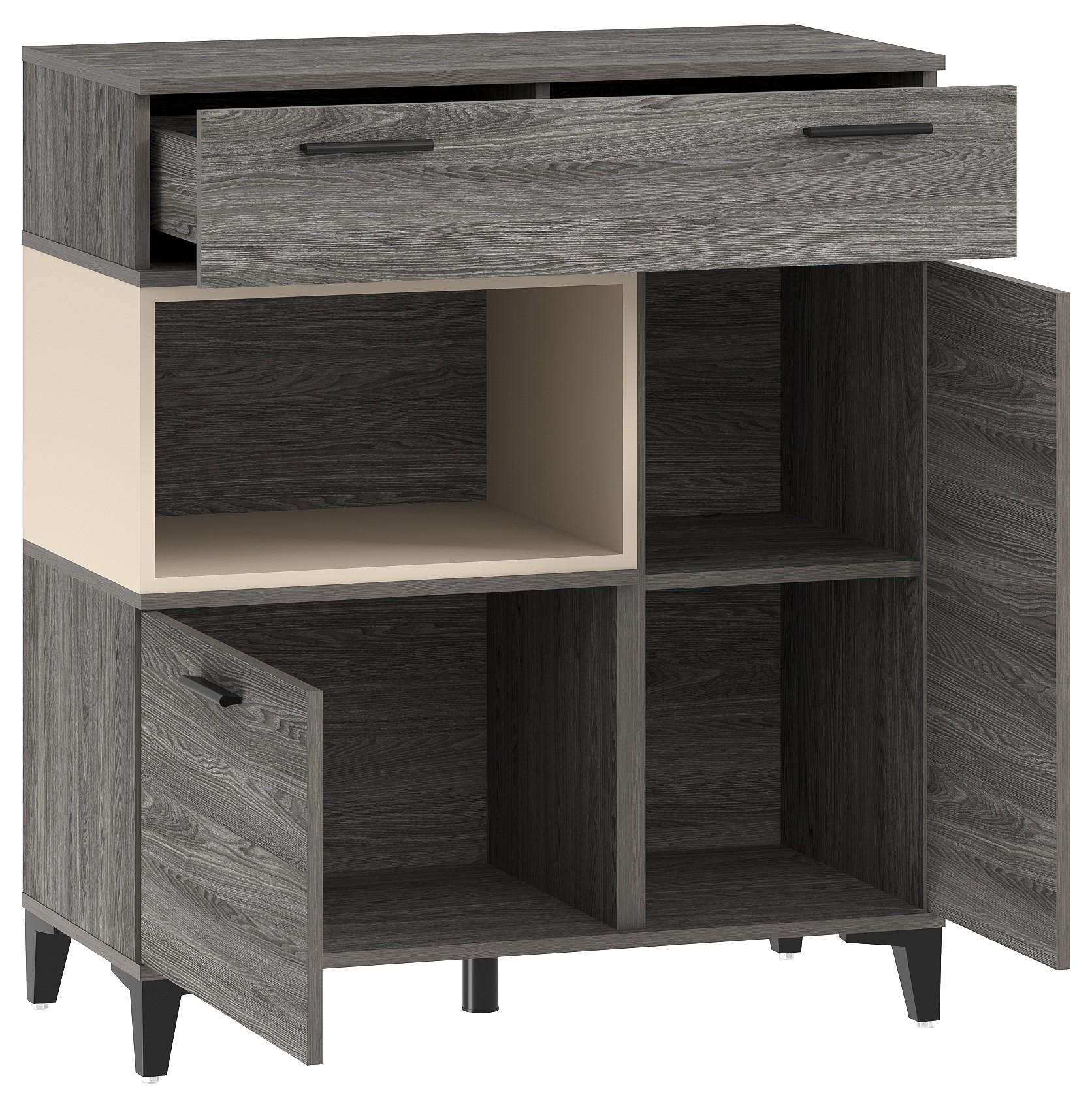 Тумба с выдвижным ящиком на шариковых направляющих, с двумя распашными дверцами и открытой полкой.